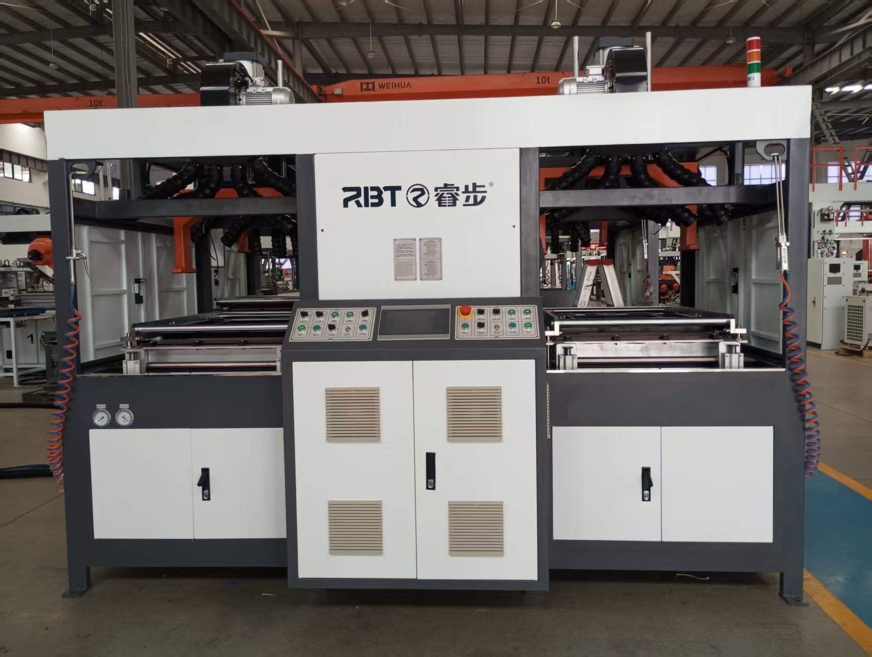 हीटिंग प्रक्रिया के दौरान पॉलीकार्बोनेट सामग्री की स्थिरता सुनिश्चित करने के लिए, प्लेटों को ओवरहीटिंग के कारण गिरने से रोकने के लिए उपकरण एक लेजर दूरी मीटर से सुसज्जित है। इसके अलावा, वैक्यूम बॉक्स का डिज़ाइन पर्याप्त वैक्यूम क्षमता की गारंटी देता है। बाएँ और दाएँ दोनों फॉर्मिंग स्टेशन ब्लोइंग, पहली बार एक छोटा वैक्यूम, दूसरी बार एक बड़ा वैक्यूम और डिमोल्डिंग ब्लोइंग उपकरणों से सुसज्जित हैं, और प्रवाह दर को गेट वाल्व स्विच द्वारा सटीक रूप से नियंत्रित किया जाता है।
